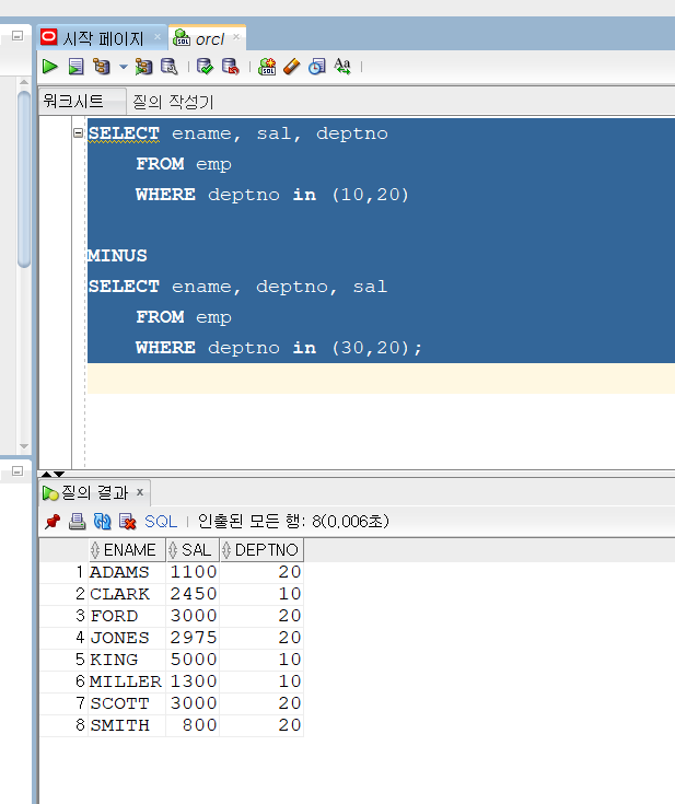 UNION, INTERSECTM, MINUS는 결과 데이터정렬, 중복제거를 해준다.