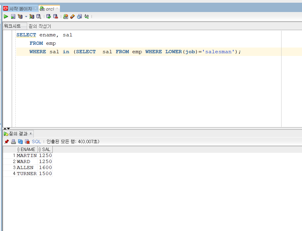 71에서는 하나의 값을 서브쿼리에서 불러왔다면 이번엔 여러 행을 한번에 서브쿼리에서 불러와서 활용해보자