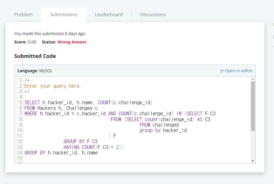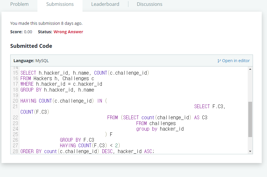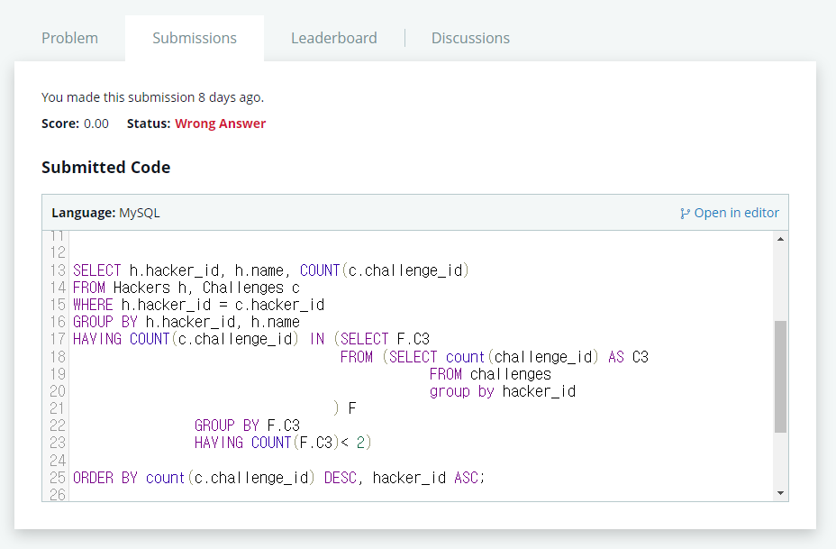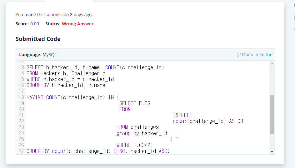 서브쿼리 내에서 중복된 값을 제외해야하는데 challenge_id 개수가 2개 이하인 것을 출력하는 것이라서 잘못되었다.