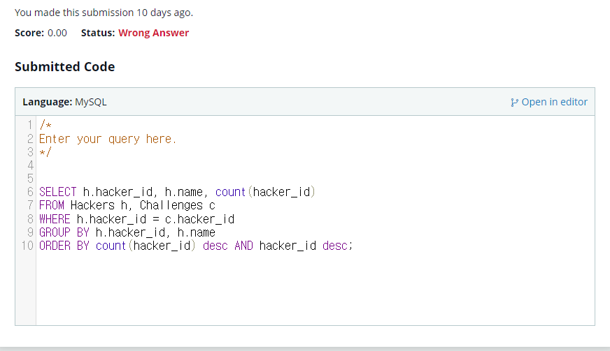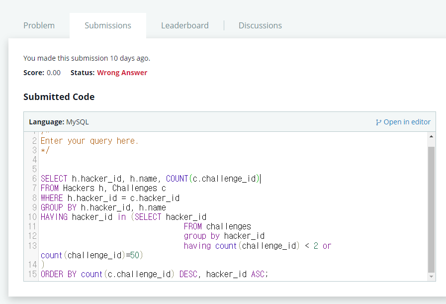 서브쿼리 내에서 중복된 값을 제외해야하는데 challenge_id 개수가 2개 이하인 것을 출력하는 것이라서 잘못되었다.