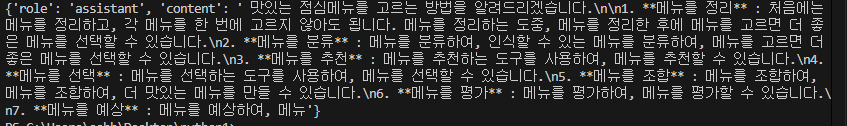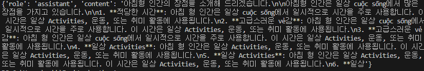위 코드와 같이 한국어 질문을 입력하면 답변이 나오기는 했지만, 영어 모델에 비해 약간의 부족함이 느껴졌습니다.