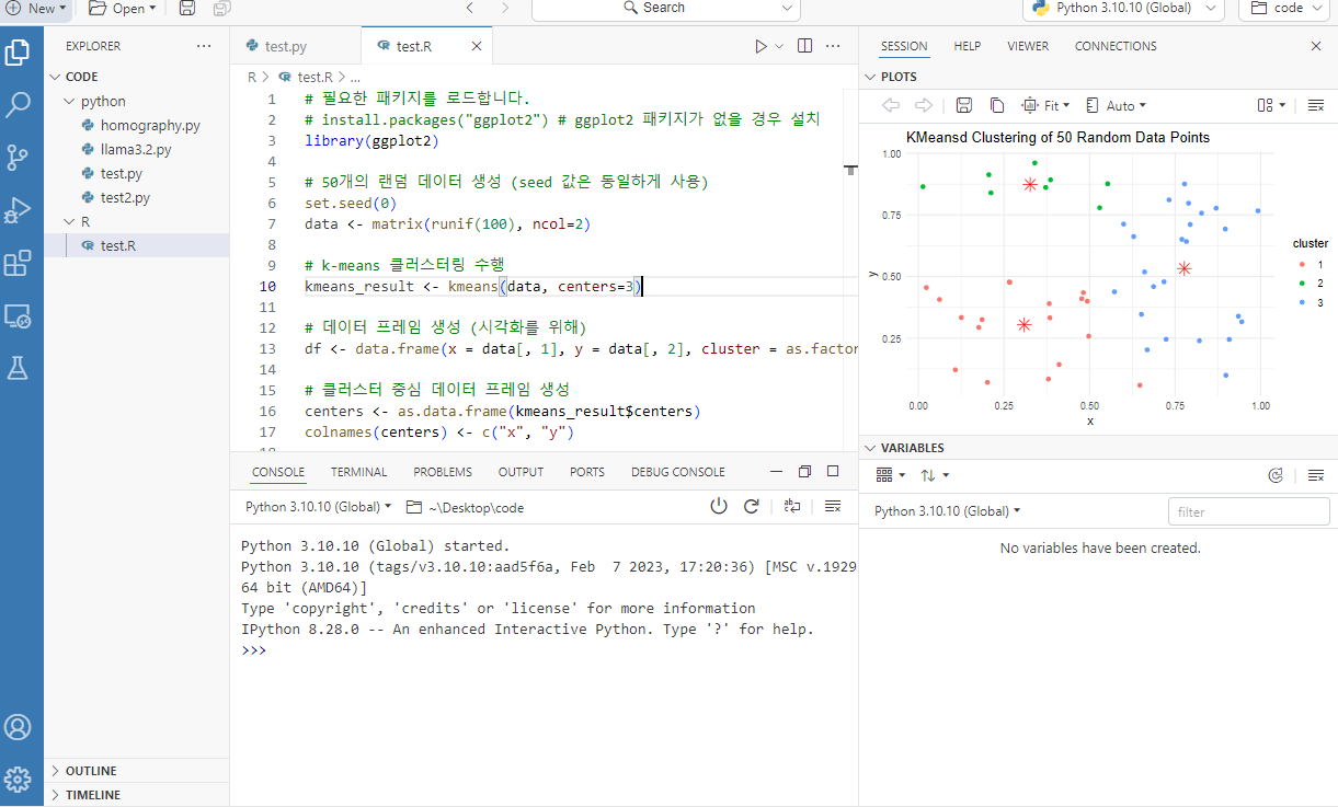 Positron에서 R을 사용한 클러스터링 역시 매끄럽게 수행할 수 있습니다. 아래는 동일한 k-means 클러스터링을 R로 구현한 코드입니다: