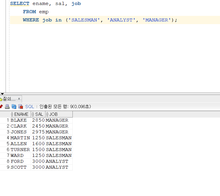 SALESMAN, ANALYST, MANAGER의 직업을 가진 사람과 봉급을 뽑아보자