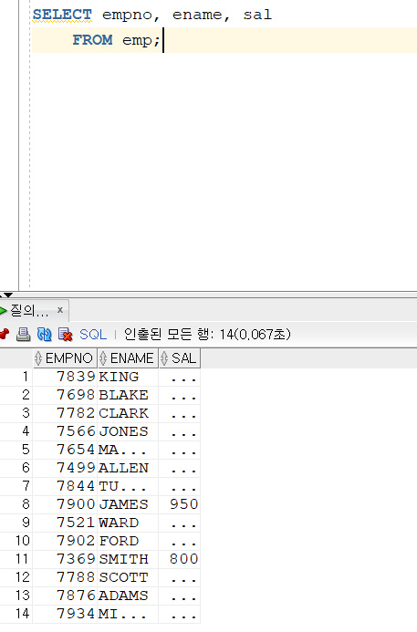 다음과 같이 emp라는 데이터셋의 empno, ename, sal을 불러오는 코드를 작성하였다.
