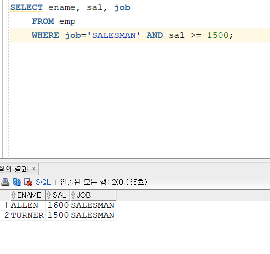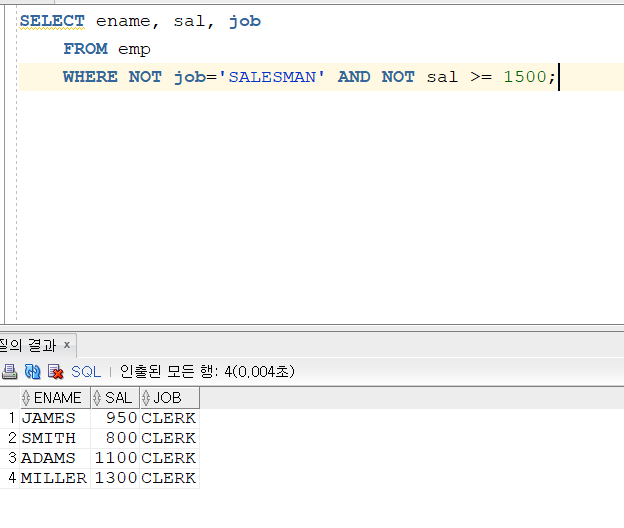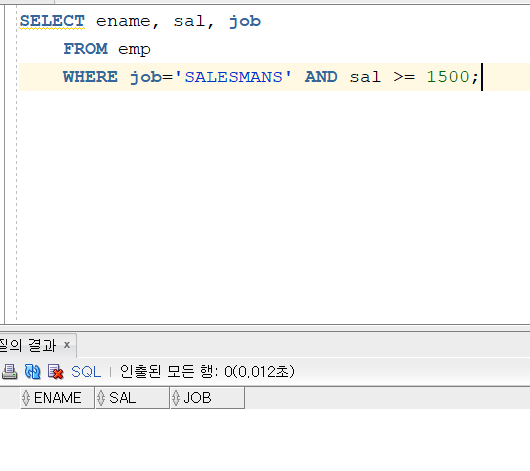 아래 예시는 SALESMAN이 아니고 봉급이 1500미만인 데이터를 불러온다.
