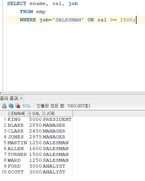 아래 작성한 것은 SALESMAN이 아니고 봉급이 1500이상인 사람을 출력하는 것이다.