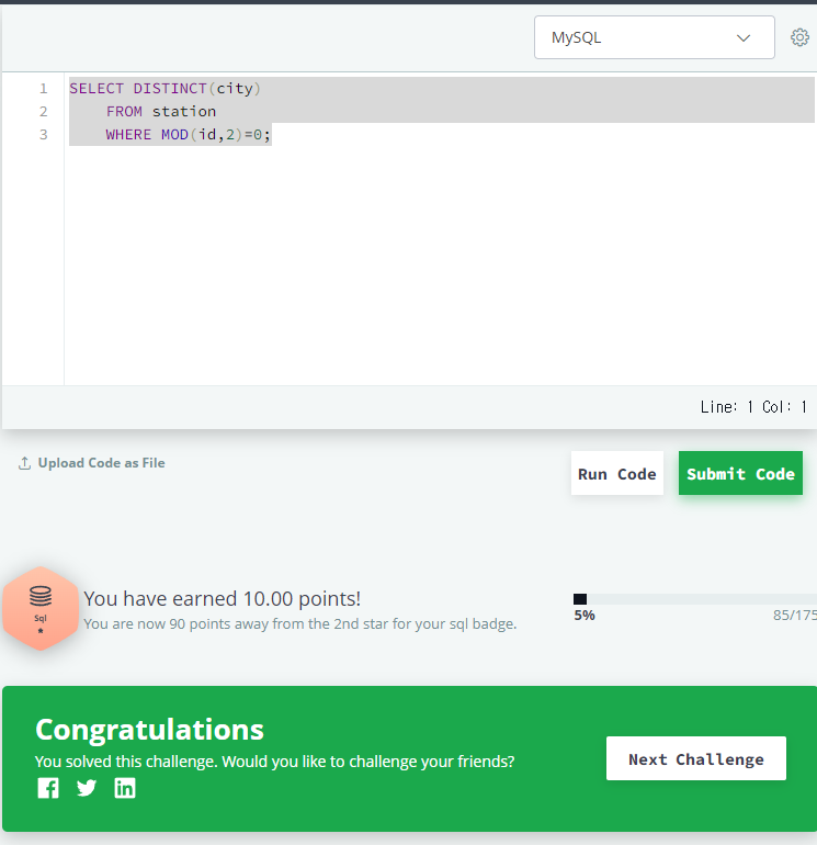 STATATION의 데이터셋에서 ID가 짝수인 도시의 NAME을 출력하라는 코드이다.