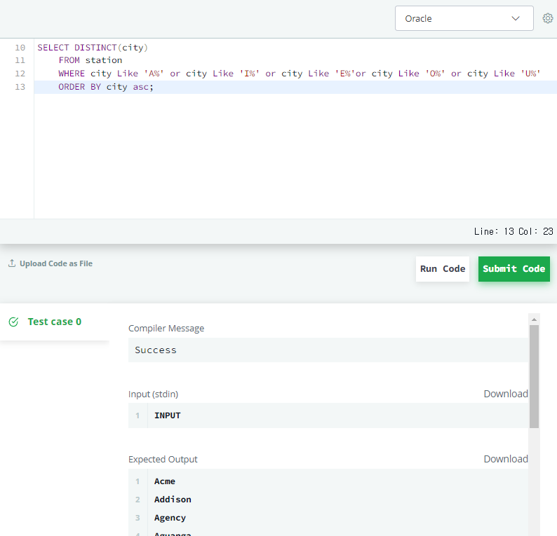 다음과 같이 정답 쿼리를 작성했다. 그런데 3번째 줄이 모든 모음을 다 나열해서 작성되었다.