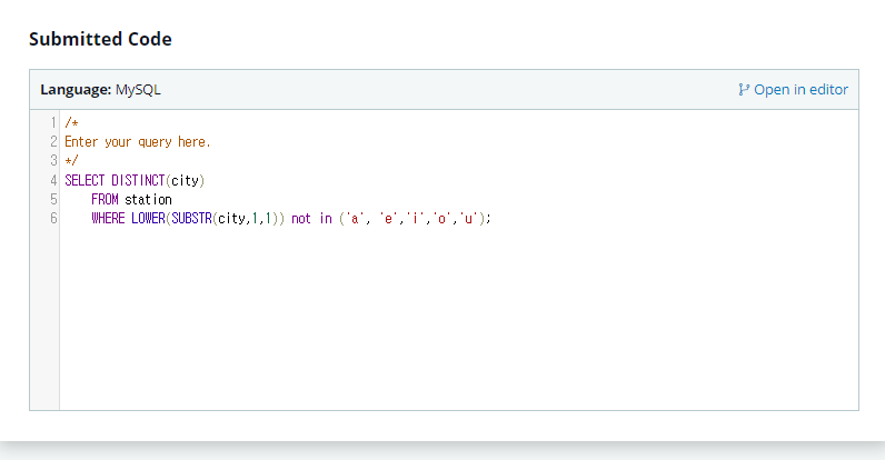 SUBSTR의 내용은 city의 첫번째 글자에서 1개만 추출하는 함수이다.