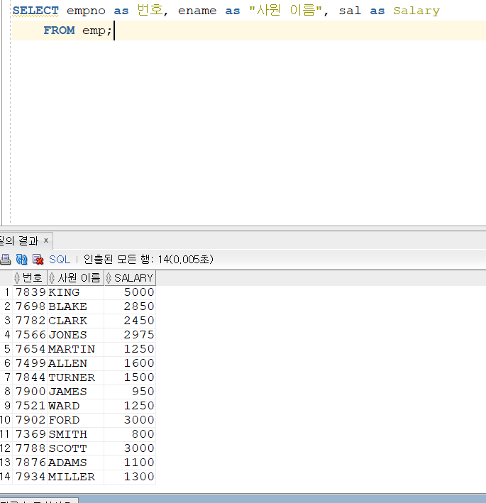 as를 통해 empno가 번호, ename이 사원이름, sal이 Salary로 변한 것을 확인할 수 있다.