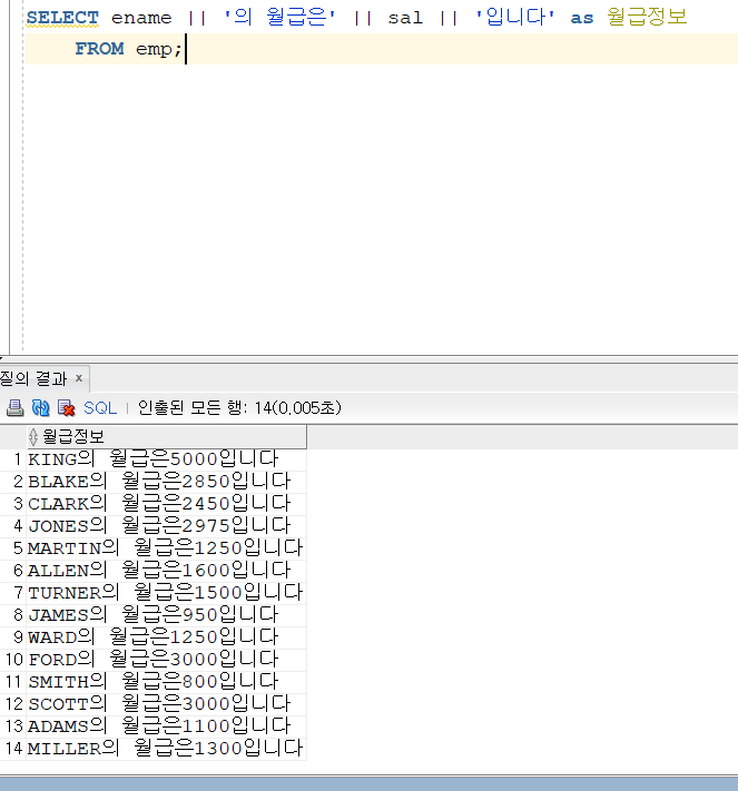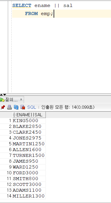1. 컬럼과 컬럼을 연결할때는 ||를 사용하면 된다.