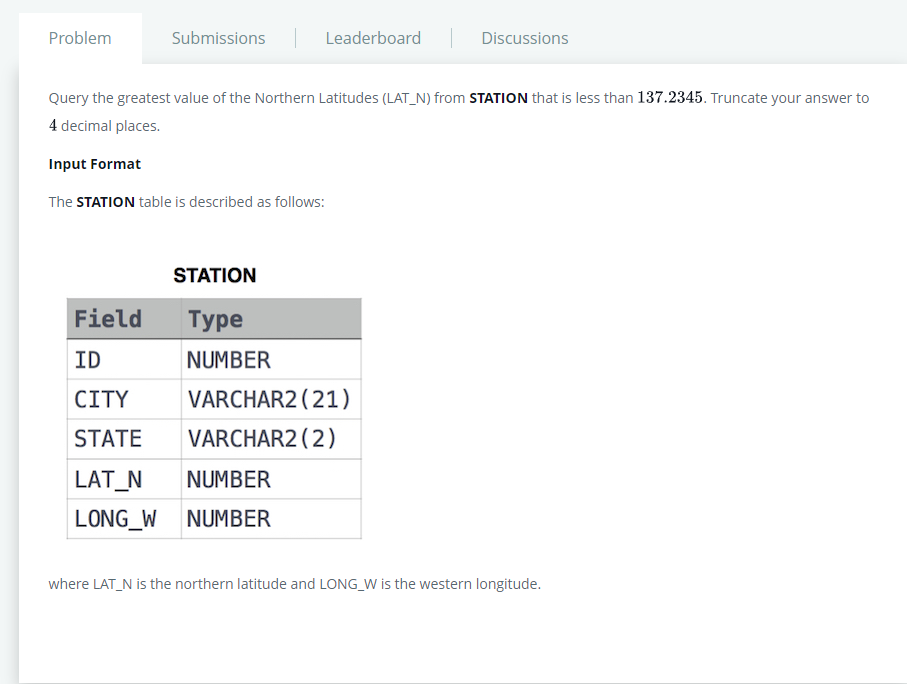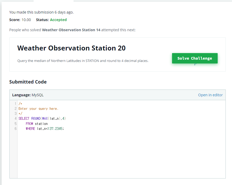 | 26. Weather Observation Station 2 (0) | 2022.05.30 |