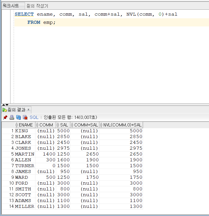하지만 아래와같이 NVL로 조금은 정확하지않지만 결측치를 보정한 값을 보여줄 수 있다.