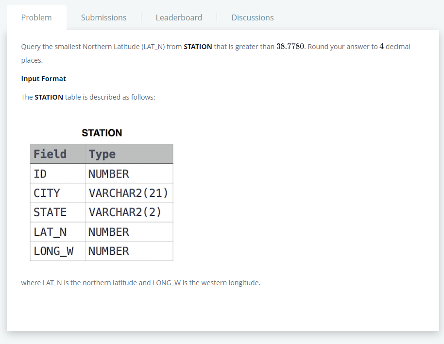 | 26. Weather Observation Station 2 (0) | 2022.05.30 |