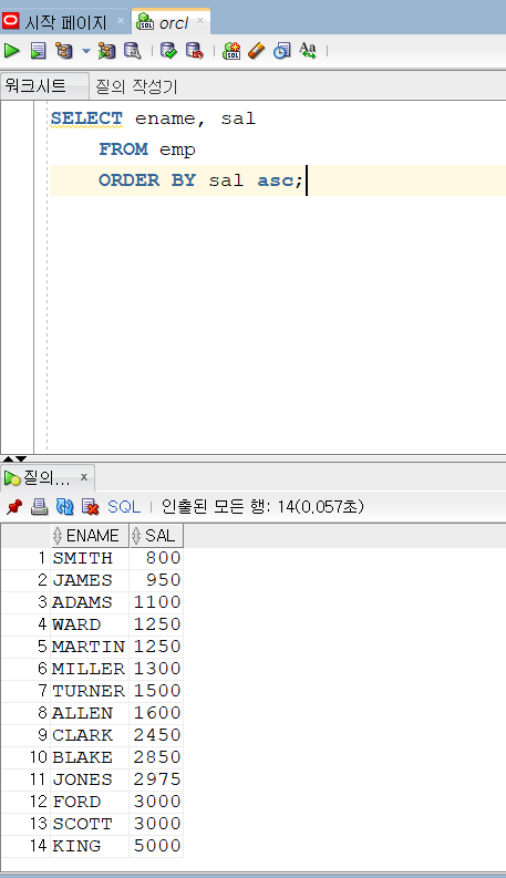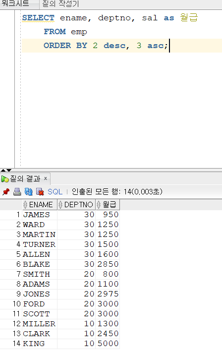deptno는 내림차순으로 우선 정리되고 같은 deptno에서 월급이 작은 순으로(오름차순) 되는 것을 볼 수 있다!!