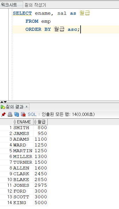원래 컬럼명, 변경한 컬럼명(월급, sal) 모두 된다.