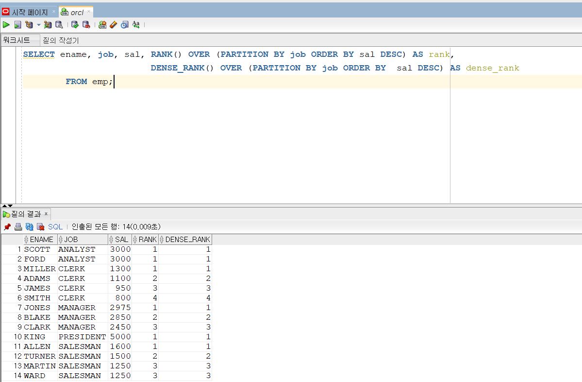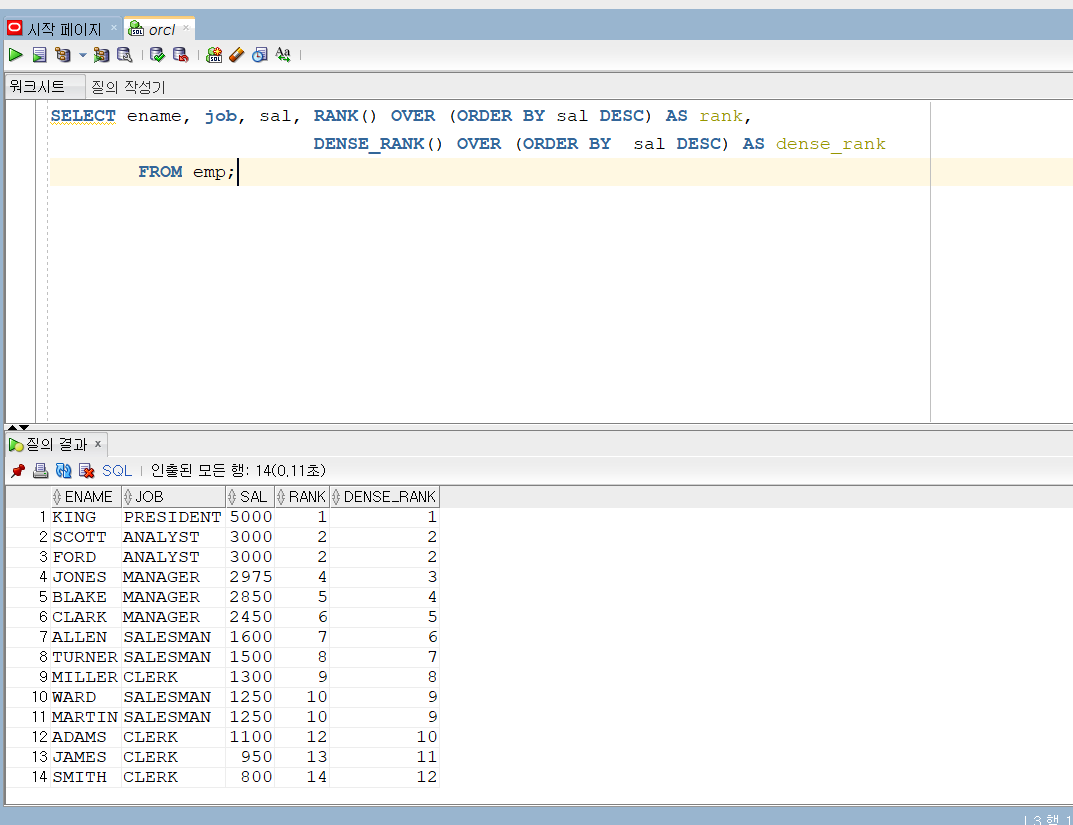 DENSE_RANK는 공동순위를 고려하지않고 산출한다.(1위가 중복이라도 그 다음은 2위)
