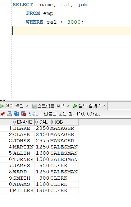 sal이 3000인 데이터를 확인하고 싶은 경우 아래와 같다.