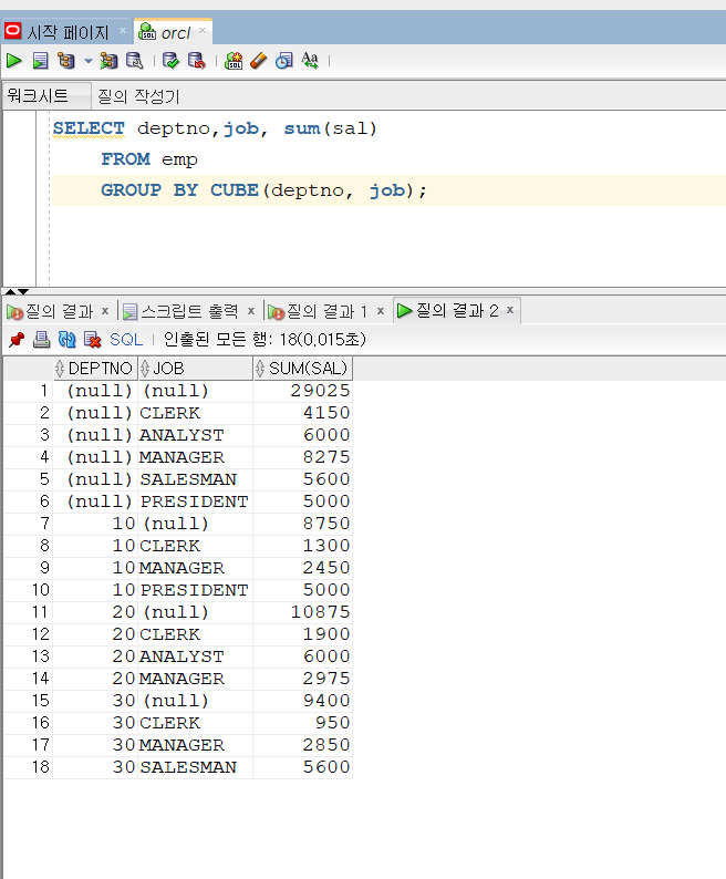 이번엔 CUBE이다. 코드는 ROLLUP과 동일하게 GROUP BY에 작성해주면된다.