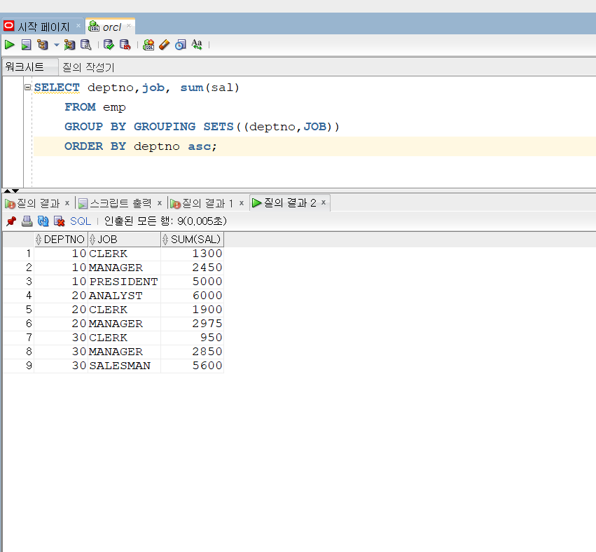 아래 예시를 보면 deptno, job, 전체 순서로 출력해 준다.