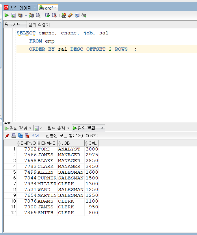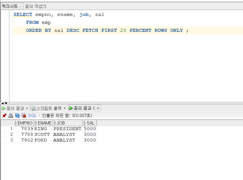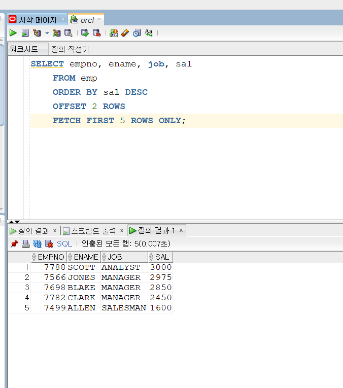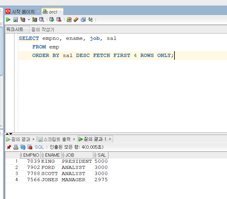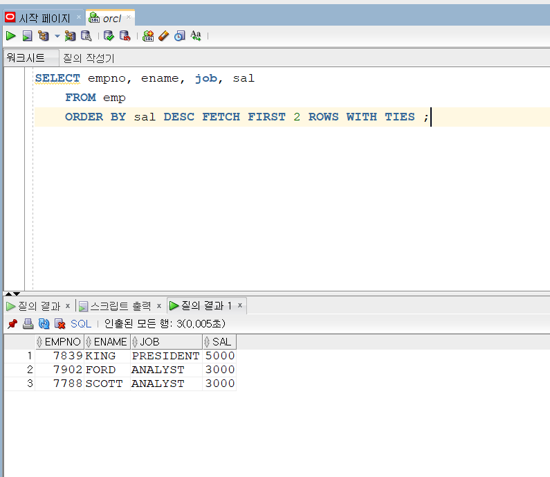 동점자도 같이 출력할 수 있다. 만약 WITH TIES를 ONLY로 썼다면 2행만 출력되었을 것이다.