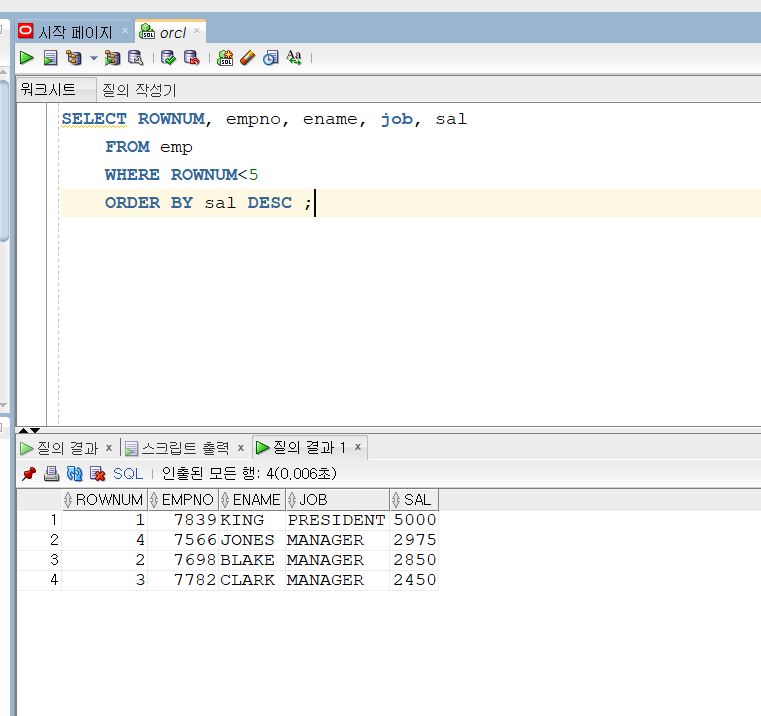 아래와 같이 ROWNUM을 쓰면 ROWNUM을 먼저 실행해서 SAL에 따른 정렬이 되지 않고 진행이된다.