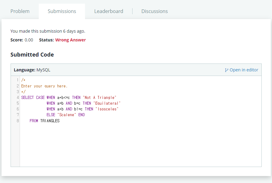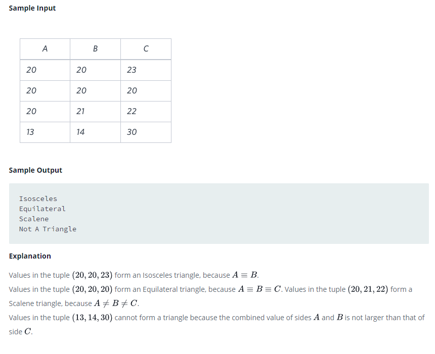 문제는 간단하다. 세 변이 주어졌고 이걸로 구성된 삼각형이 어떤 삼각형인지 출력하면된다.