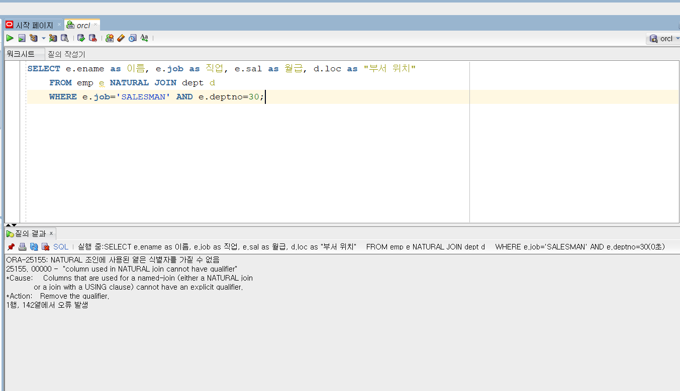 연결고리가 되는 deptno에는 데이터 별칭을 붙히지않고 작성해야한다.