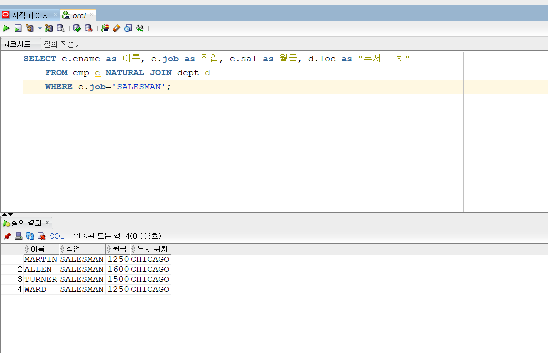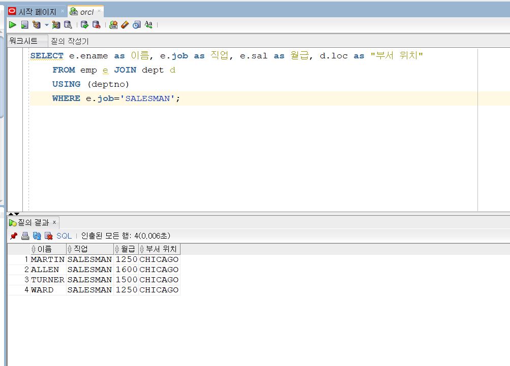 71에서는 하나의 값을 서브쿼리에서 불러왔다면 이번엔 여러 행을 한번에 서브쿼리에서 불러와서 활용해보자 직업이 salesman과 같은 봉급을 받는 사람의 이름, 봉급을 출력해보자 이번 쿼리는 내가 스스로 작성해보았다. salesman은 여러명이기 때문에 = 대신에 in으로 표현해야한다. 서브 쿼리 종류를 정리하고 마무리한다. 1. 단일 행 서브 쿼리 : 서브 쿼리에서 메인쿼리로 1개의 값이 반환됨 2. 다중 행 서브 쿼리 : 서브 쿼리에서 메인쿼리로 여러개의 값이 변환됨 3. 다중 컬럼 서브 쿼리 : 서브 쿼리에서 메인 쿼리로 여러 개의 컬럼 값이 변환됨 1 ,2는 진행했고 다중 컬럼 서브 쿼리는 차차 공부해보자