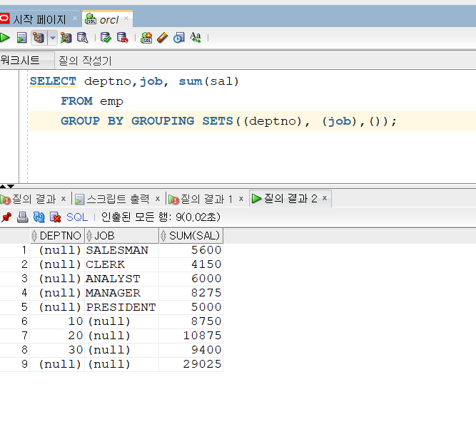 54. 집계 결과 출력3(GROUPING SETS) 요약 1. GROOUPING SETS도 집계 결과 출력이 된다. 2. ROLLUP, CUBE보다 훨씬 기능도 많아서 가장 유용해보인다. 다른 집계 결과 출력을 해보자 이번은 GROUPING SETS이다. 이것의 다른 점은 앞에 ROLLUP, CUBE는 이중, 3중으로 필터가 되어 집계 결과를 출력했다. 이번엔 독립적으로 집계 결과를 보여줄 수 있는 함수이다. 아래 예시를 보면 deptno, job, 전체 순서로 출력해 준다. 물론 ROLLUP, CUBE에 있는 여러가지 변수를 조합한 총계 집계도 가능하다. 괄호안에 여러 변수를 넣으면 출력이 된다. 기능도 다양하고 간단해서 GROUPING SETS로 ROLLUP, CUBE를 대신하는 것이 편해보인다. 코딩/SQL 2022.06.04