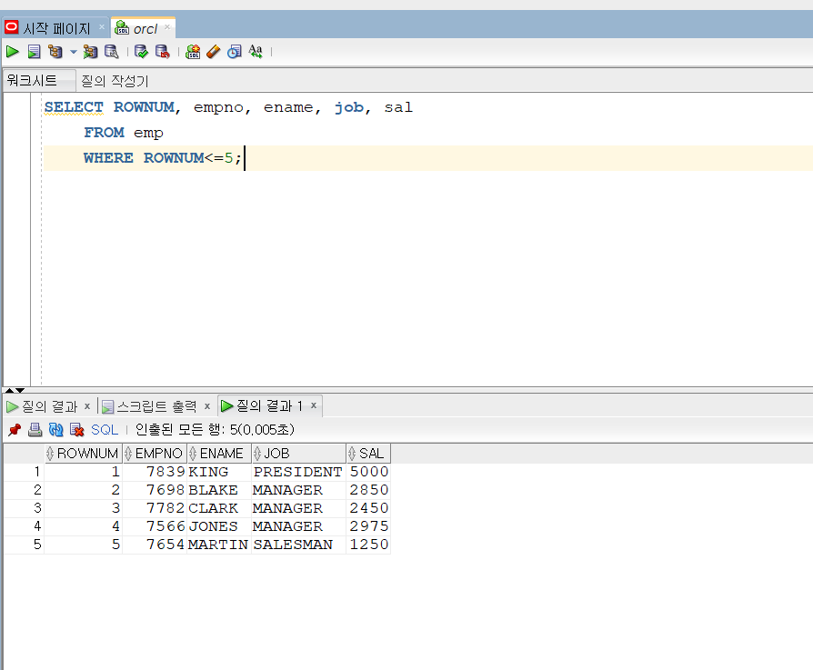 57. 출력 행 제한2(Simple TOP-n Queries) 요약 1. FETCH FIRST ~~ 로 출력되는 행을 정할 수 있다. 2. 퍼센트, 시작되는 행 선택(OFFSET) 등 다양한 기능이 많다. 3. ROWNUM보다 더 기능이 많다. 아래와 같이 4개의 행을 출력할 수 있다. 아래와 같이 ROWNUM을 쓰면 ROWNUM을 먼저 실행해서 SAL에 따른 정렬이 되지 않고 진행이된다. 퍼센트로 상위 부분을 출력할 수 있다. 동점자도 같이 출력할 수 있다. 만약 WITH TIES를 ONLY로 썼다면 2행만 출력되었을 것이다. 출력되는 행을 선정할 수도 있다. 아래 예시는 3번째 행부터 출력한다(1~2행은 제외) 다음과 같이 OFFSET과 FETCH FIRST를 묶어서 원하는 것 표현이 가능하다. 코딩/SQL 2022.06.05