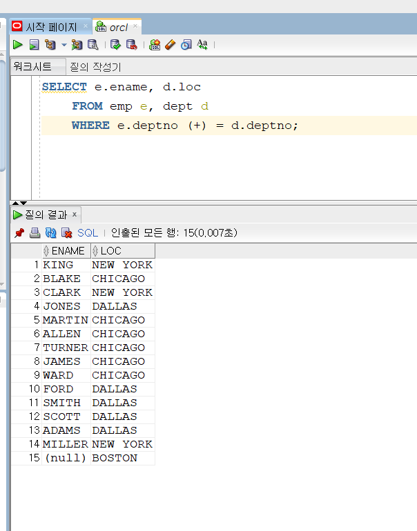 60. 조인3(OUTER JOIN) 요약 1. 한쪽에만 존재하는 데이터를 보여주려면 (+)를 부족한 쪽에 작성해주면된다. 이번엔 EQUI JOIN에서 볼 수 없던 것도 출력해보자 지난번 EQUI에서는 BOSTON이 출력되지않았다. 왜냐하면 emp 데이터에서 보스턴에 해당되는 사람이 없었기 때문이다. EQUI JOIN에서 부족한 부분에 (+)를 추가해주면 된다. 코딩/SQL 2022.06.06