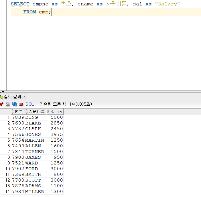 요약 1. as를 이용하면 컬럼(변수)의 이름을 변경할 수 있다. 2. 따옴표(")를 사용하면 내가 원하는 정확한 변경이 가능하다.(대소문자 구분, 공백문자, 특수문자($,_,# 가능) 3. 별칭을 사용하면 ORDER BY절을 사용할 때 유용하다고 하니 기억해두자! **주의 : 컬럼 = 변수임 변수의 이름을 바꾸고 싶을때가 많다. 한글로 바꿔서 알아보고 쉽게 만들거나, 변수명이 너무 길어 짧게 만드는 경우도 있다. 나는 R에 익숙해서 R의 colnames로 바꾸곤하는데 SQL에서도 비슷한 기능이 있다고한다. 그것은 바로 as!!! 바로 실습을 해보자 as를 통해 empno가 번호, ename이 사원이름, sal이 Salary로 변한 것을 확인할 수 있다. Salary는 따옴표를 써서 바꾼 것을 볼 수 있..