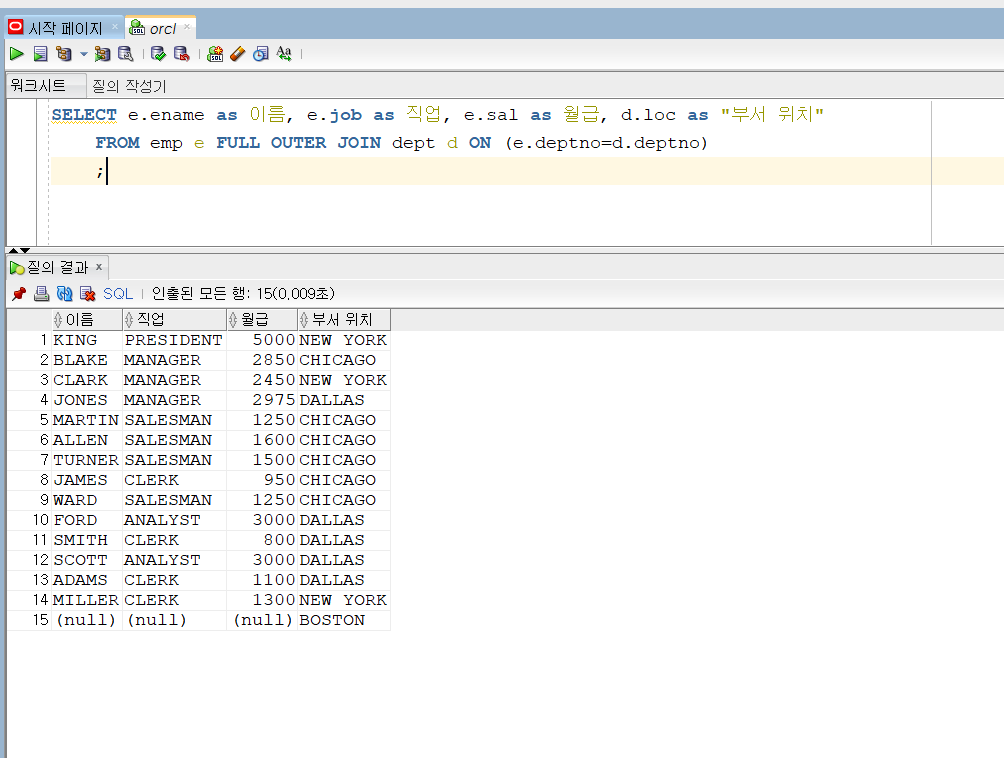 66. 조인9(FULL OUTER JOIN) 두 데이터의 합집합을 출력해보자 FULL OUTER JOIN만 기억하면 된다. 그 결과 양측에 다 있지않고 둘 중 하나에 있어도 출력해준다. 오라클 조인에서는 (+)를 한 부분에서만 쓸 수 있어서 OUTER JOIN을 바로 표현하는 것은 불가능하다. UNION을 사용해서 할 수 있다고하니 다음 단원에서 UNION을 공부해보자 코딩/SQL 2022.06.09