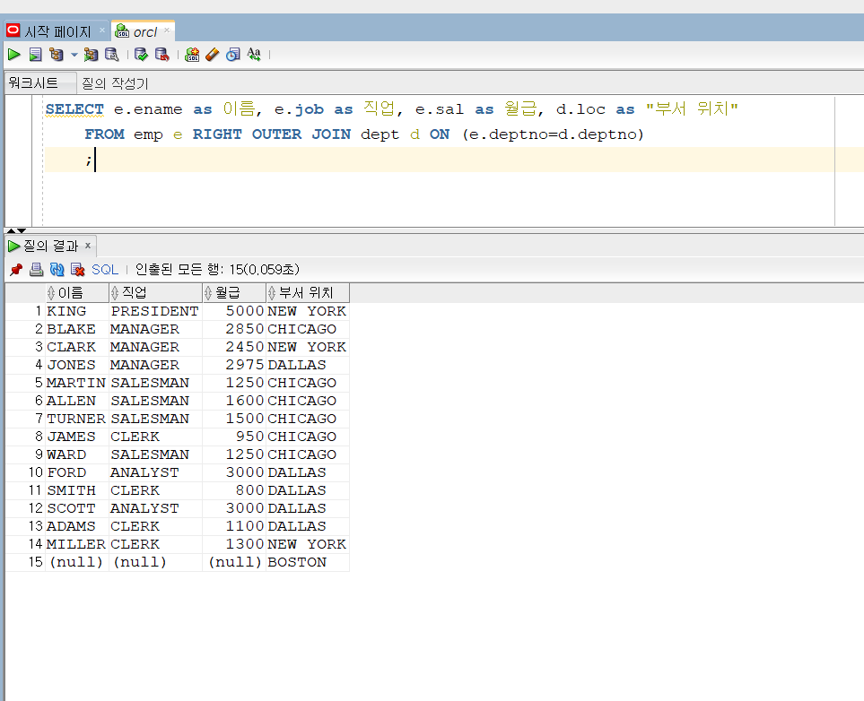 60. 조인3(OUTER JOIN) 요약 1. 한쪽에만 존재하는 데이터를 보여주려면 (+)를 부족한 쪽에 작성해주면된다. 이번엔 EQUI JOIN에서 볼 수 없던 것도 출력해보자 지난번 EQUI에서는 BOSTON이 출력되지않았다. 왜냐하면 emp 데이터에서 보스턴에 해당되는 사람이 없었기 때문이다. EQUI JOIN에서 부족한 부분에 (+)를 추가해주면 된다. 코딩/SQL 2022.06.06