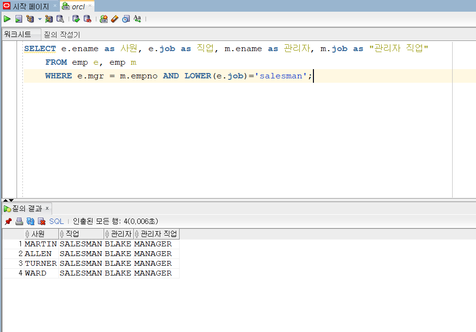 61. 조인4(SELF JOIN) 요약 1. SELF JOIN은 한 데이터에서 JOIN을한다 mgr 변수는 사원의 관리자를 알려주는 변수이다. 번호로 되어있는 mgr을 이용해서 관리자 이름으로 출력해보자 코딩/SQL 2022.06.06