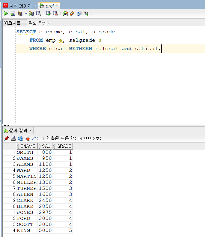 59. 조인2(NON EQUI JOIN) 요약 1. 범위 안에 있는 데이터와 연결하고싶으면 BETWEEN 2. 조금 어려워진다... 여러 테이블의 데이터를 조인하는 것 중 이번엔 NON EQUI JOIN이다. 앞으로 몇가지 조인 방법을 배우는데 익숙해져보자 EQUI JOIN에서는 같은 데이터를 엮어서 표현했다. 하지만 이번엔 같은 변수가 없다. 그러나 salgrade의 losal, hisal 사이에 있다. 이 사이의 값을 가져와서 출력해보자 그건 BETWEEN 함수로 가능하다. WHERE A BETWEEN B AND C 이면 A는 B,C 사이이의 값과 동일하다고 표시된다. 아래 예시는 봉급의 등급을 표현하는 것이다. emp의 sal은 salgrade의 losal과 hisal 사이에 있다고 생각하면 된다. 코딩/SQL 2022.06.06