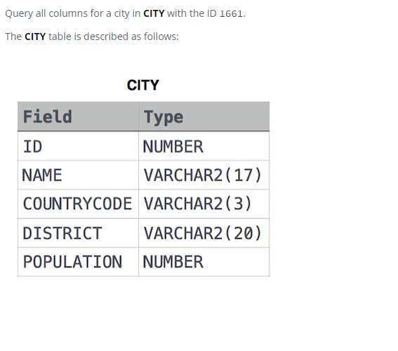 4. SELECT BY ID 이번엔 오랜만에 코딩테스트 문제를 풀어보자 CITY데이터셋에서 ID가 1661인 데이터를 뽑아내는 쿼리를 작성하면된다. 난이도가 쉬워서 그런지 아직은 간단하게 작성이 가능하다. 한번에 못풀정도로 고민하는 문제가 나올때까지 열심히 해보자 코딩/SQL 코딩테스트 2022.05.12