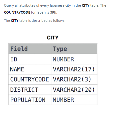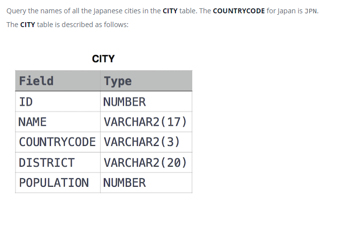 5. JAPANESE CITIES' Attributes 일본의 도시 정보를 꺼내보자!! 이거는 한번에 성공은 못했다.. 왜 틀린지 처음엔 이해를 못했다. 근데 MySQL에서 하니깐 잘 된다. 두 플랫폼에서 따옴표에 대한 사용법이 다른거로 보인다. 나는 그동안 한번도 이런적이 없어서 조금 허둥되었는데 다음엔 유의해서 하자 oracle도 작은 따옴표로 하면 잘 되니 넘 걱정하지는 말자~~ 코딩/SQL 코딩테스트 2022.05.12