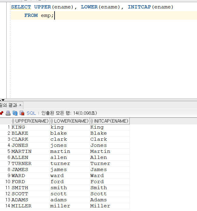 16. 대소문자 변환(UPPER, LOWER, INITCAP) 요약 1. 대문자 변환 : UPPER 2. 소문자 변환 : LOWER 3. 첫글자만 대문자 : INITCAP 대소문자 중 어떻게 데이터가 구성되있을지 모른다. 이럴때 어떻게 해야할지 살펴보자 UPPER, LOWER, INITCAP를 사용하면 각 데이터를 대문자, 소문자, 첫글자만 대문자로 출력할 수 있다. 다음과 같이 활용 가능하다. 나는 데이터의 구성을 모르는데 아무튼 scott을 찾아야한다. 이때 scoTT, scoTt, SCott 어떻게 데이터가 되어 있는지 모르므로 다음과 같이 구성하는 것이 필요하다. UPPER, LOWER는 검색할때 유용할 것 같고 INICAP은 출력할 때 예쁘게 보이는거 같다. 코딩/SQL 2022.05.10